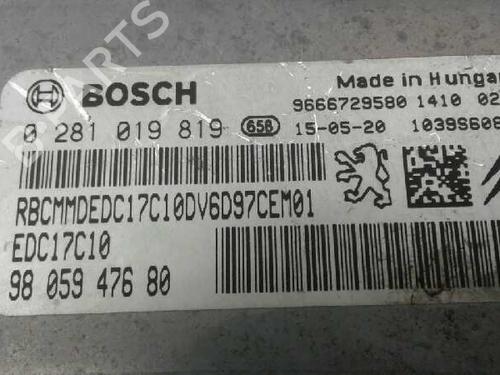 The reference 0281019819 corresponds to a Bosch EDC17C10 engine control unit used in Citroën and Peugeot vehicles with a 16 HDi engine. Its price varies depending on the condition and the seller. Technical specificationsManufacturer: BoschBosch reference: 0281019819 / 0 281 019 819Associated PSA reference: 9805947680 / 98 059 476 80Management system: EDC17C10-511Compatible engine: 16 HDi (DV6C 9HP)Typical power: 92 CVVoltage: 12 VFunctions: Control of injection, turbo, EGR sensors, electronic engine management. Compatible vehiclesMakeModelApproximate yearEngineFuelCitroënC3 II / C42009–201516 HDiDieselPeugeot208 / Expert2012–201616 HDiDieselAlso compatible with other PSA versions with DV6C engine and EDC17C10 system